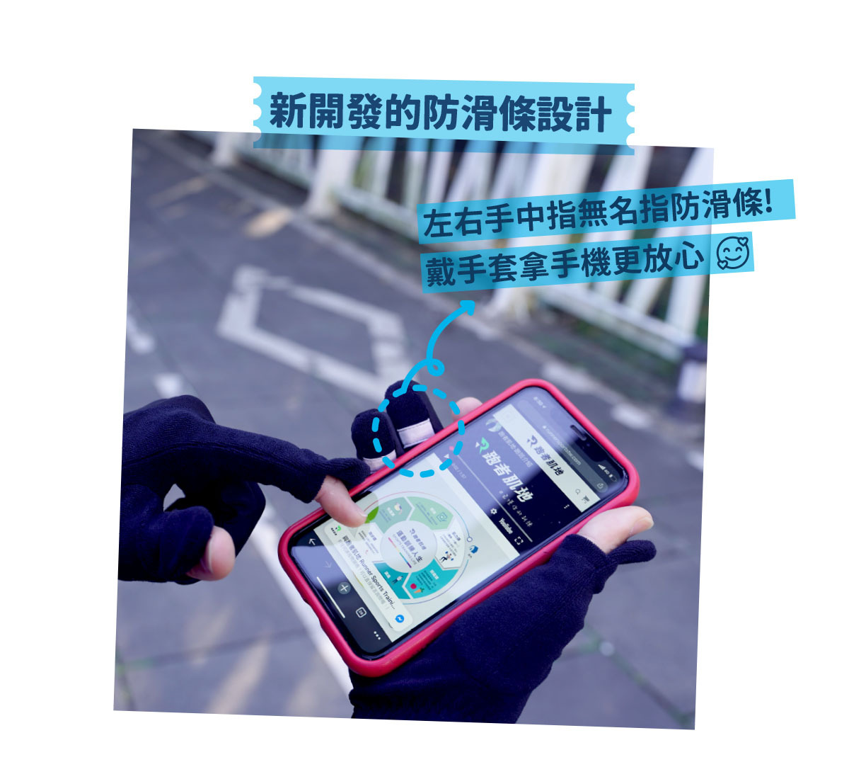 ⚡左右手的中指與無名指的指節處,新開發出手機防滑設計!戴手套拿手機更放心~